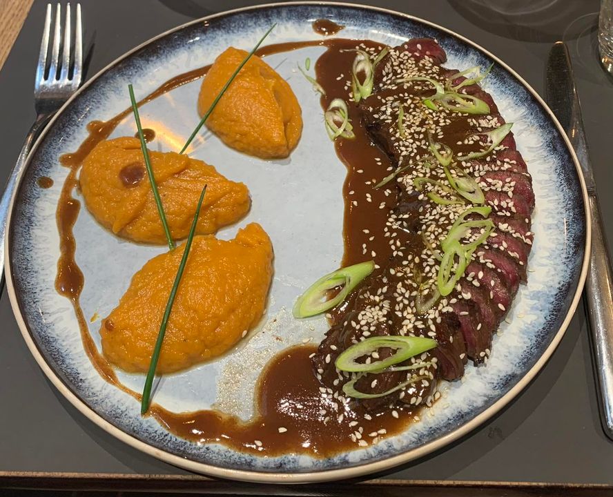 Coucou ???? Pour ceux qui n’ont pas encore pris leur pause déjeuner, nous vous accueillons aujourd’hui Avec : Un Tataki de bœuf aux 2 sésames Et sa mousseline de patate douce au gingembre
