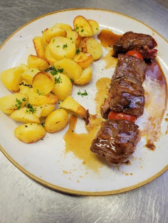 Bonjour ! Pour votre pause déjeuner Petite grillade avec notre brochette de bœuf mariné au condiment chimichurri et ses pommes sautées aux herbes 😋