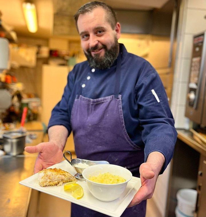 Bonjour 👋 Ce midi, notre Chef vous propose Un dos de lieu noir façon fish and chips 🎣! Et son savoureux Bibeleskaes 😋😋 À plus ! #strasbourg #alsace #laclocheresto #food #fromage #cheeselover #restaurant #platdujour #restaurantstrasbourg