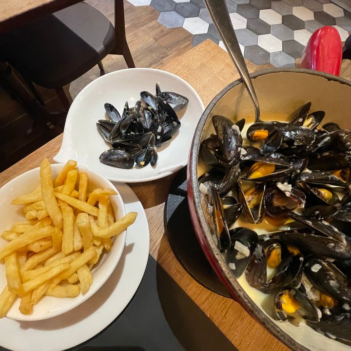 Bonjour, Ce midi, en suggestion: Moules de bouchot, sauce au bleu de Gex frites – maison – À plus tard 👋 #strasbourg #alsace #laclocheresto #restaurantstrasbourg