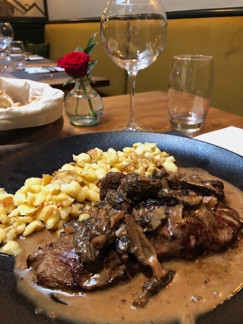 Bonjour, Ce midi : Onglet de veau, sauce crème aux champignons spaetzles au Saint-Félicien 😉 #strasbourg #alsace #laclocheresto #restaurantstrasbourg