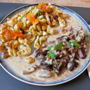 Ce samedi à déjeuner, Civet de cerf aux airelles, compote de coing et spaetzles au Saint-Félicien !! 😉