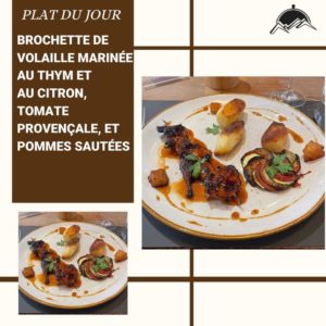 Bonjour, Au menu : Brochette de volaille marinée au thym et au citron Tomate provençale, pommes sautées À […]